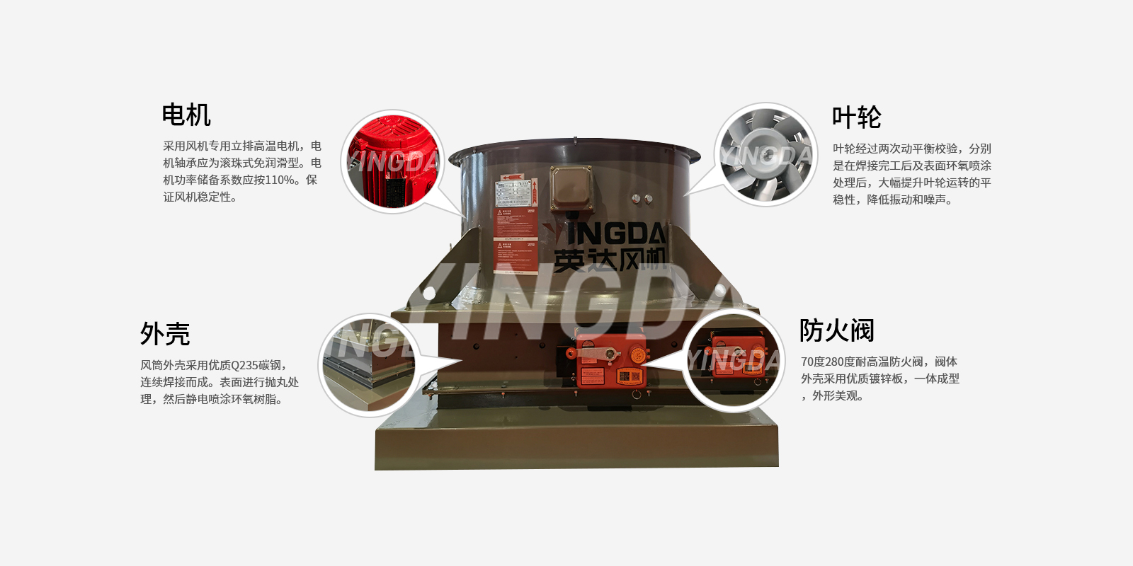 1.1.DWT(HTF)型軸管廊消防排煙,其基本形式為軸流屋頂式結構,電機采用耐高溫電機,產品按GA211-2009《消防排煙風機耐高溫試驗方法》進行耐高溫試驗,通過公安部消防產品合格評定中心3C強制性認證,可在介質溫度280℃。高溫條件下連續運轉30分鐘以上,100℃溫度條件下連續20小時/次不損壞,可通風排煙兩用。