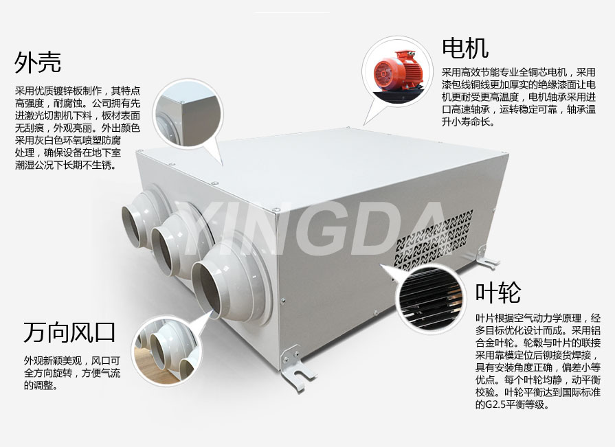 英達風機采用優質鍍鋅板制作,其特點高強度,耐腐蝕。公司擁有先進激光切割機下料,板材表面無刮痕,外觀亮麗。外出顏色采用灰白色環氧噴塑防腐處理,確保設備在地下室潮濕公況下長期不生銹。