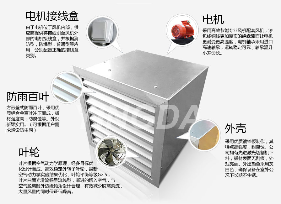 DFBZ型壁式軸流風機葉輪采用寬葉片大弦長、空間扭曲、傾斜式葉形,可在低速時達到所需風量、風壓降低風機噪聲,風機機殼外層方形,內層為圓形,可進一步降低風機噪聲。風機安裝于墻體內,靠墻側裝有鋁合金防雨百葉,可以防止室外雨水和自然風向室內倒灌。